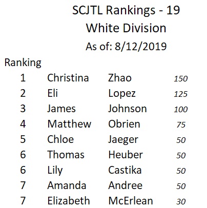 Point based ranking generated from participation by SCJTL program registered players and results from SCJTL Challenge Series Tournaments and Ranking Points events. Each event generates points toward SCJTL published ranking system.